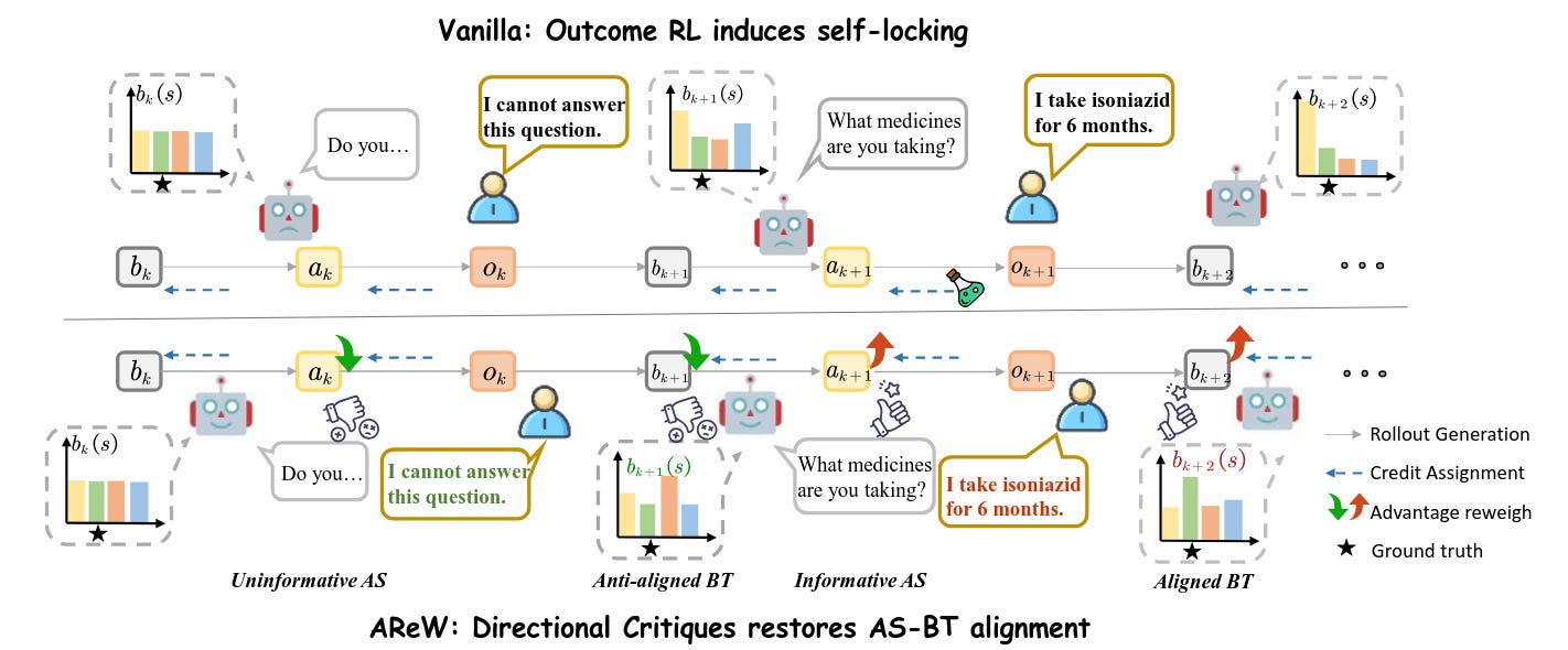 En tareas de active reasoning (preguntar para obtener información relevante), estos autores observan “self-locking”: el agente deja de hacer preguntas informativas y no internaliza bien lo ya obtenido. Descomponen el problema en selección de acción (qué preguntar) y belief tracking (cómo actualizar creencias) y proponen reinyectar señal de aprendizaje con críticas direccionales fáciles de obtener, reportando mejoras de hasta 60%.Fuente: [clic aquí]