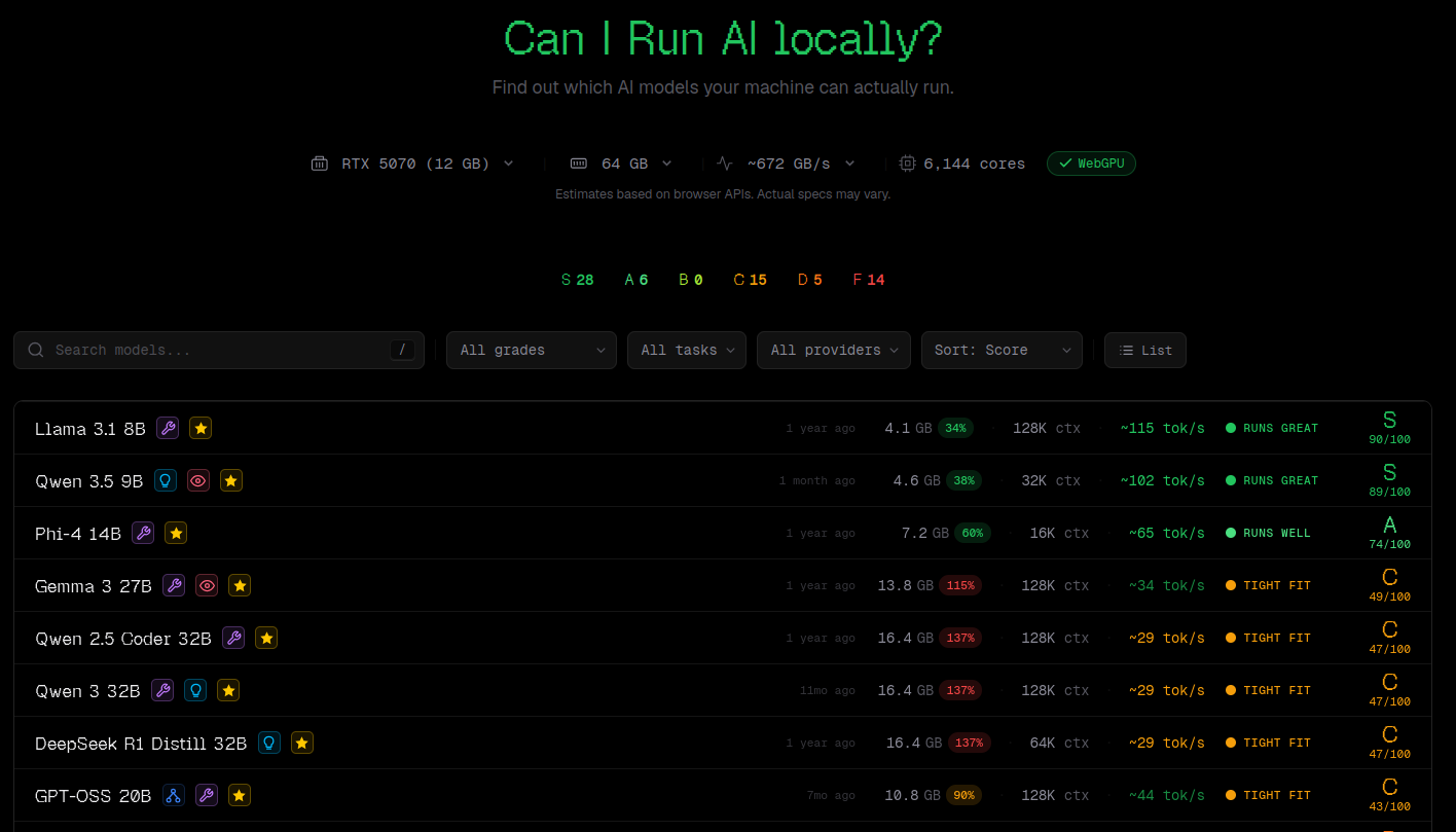 Web que calcula en tu navegador qué modelos puedes correr localmente y a qué velocidad, detectando GPU/CPU/RAM (sin enviar datos a servidor).Fuente: [clic aquí]