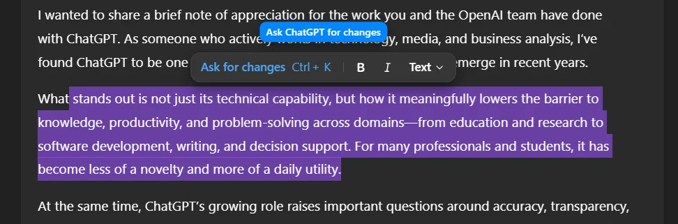 OpenAI estaría desplegando “formatting blocks” en ChatGPT para que el draft se vea y edite como un documento/tarea (no solo chat), con una mini barra de edición al seleccionar texto.