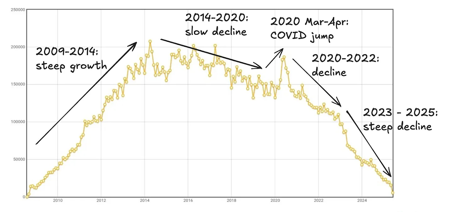 Stack Overflow cerró diciembre de 2025 con 3,862 preguntas públicas, un descenso del 78% interanual y muy lejos del pico histórico de 200,000 preguntas mensuales registrado en 2014.